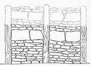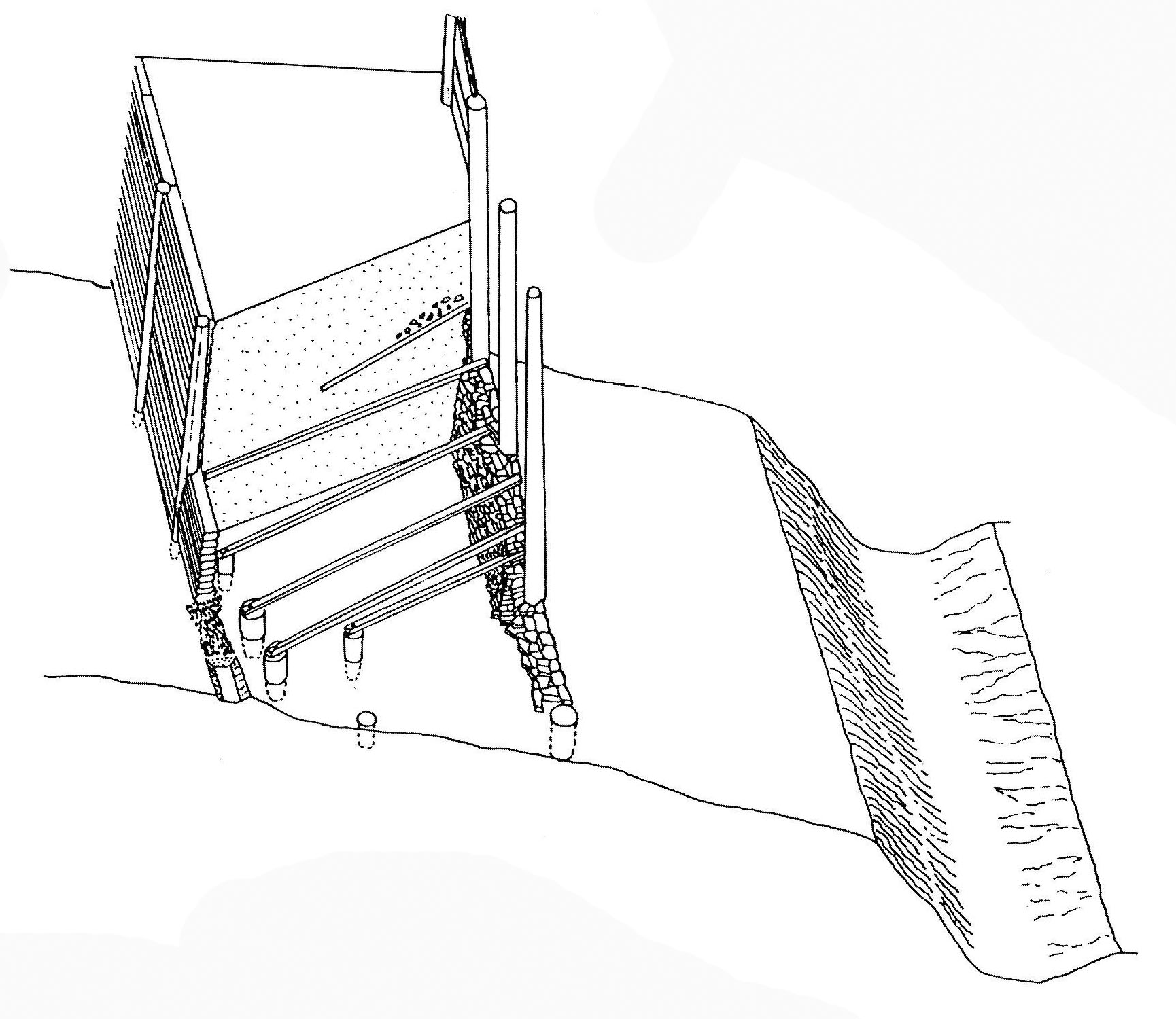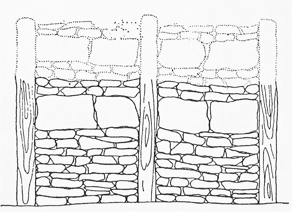 Pfostenschlitzmauer - kamenné stěny jsou vyztuženy mohutnými silnými kůly, které jsou spojeny příčnými trámy